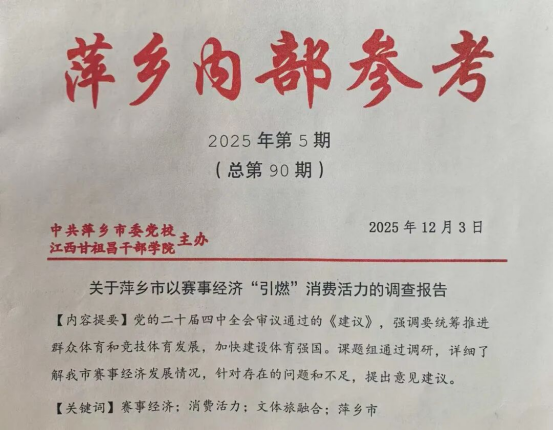 近日,我校院课题组撰写的资政报告《关于萍乡市以赛事经济“引燃”消费活力的调研报告》(《萍乡内部参考》2025年5期)获得市委主要领导批示。